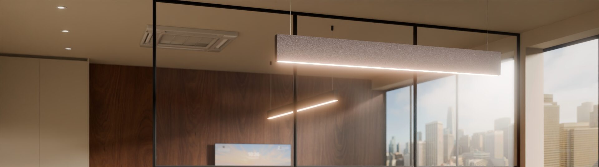 Customers can specify acoustic cladding which encompasses the sides of the Luminaire to add sound dampening qualities when installed into large open spaces such as offices, atriums, lobbies etc. Our acoustic cladding also comes in 24 vibrant colours and hues to add a pop of colour or blend into the surrounding space. The cladding is made up of 65% post-consumer recycled PET (Polyester) and 100% recyclable.